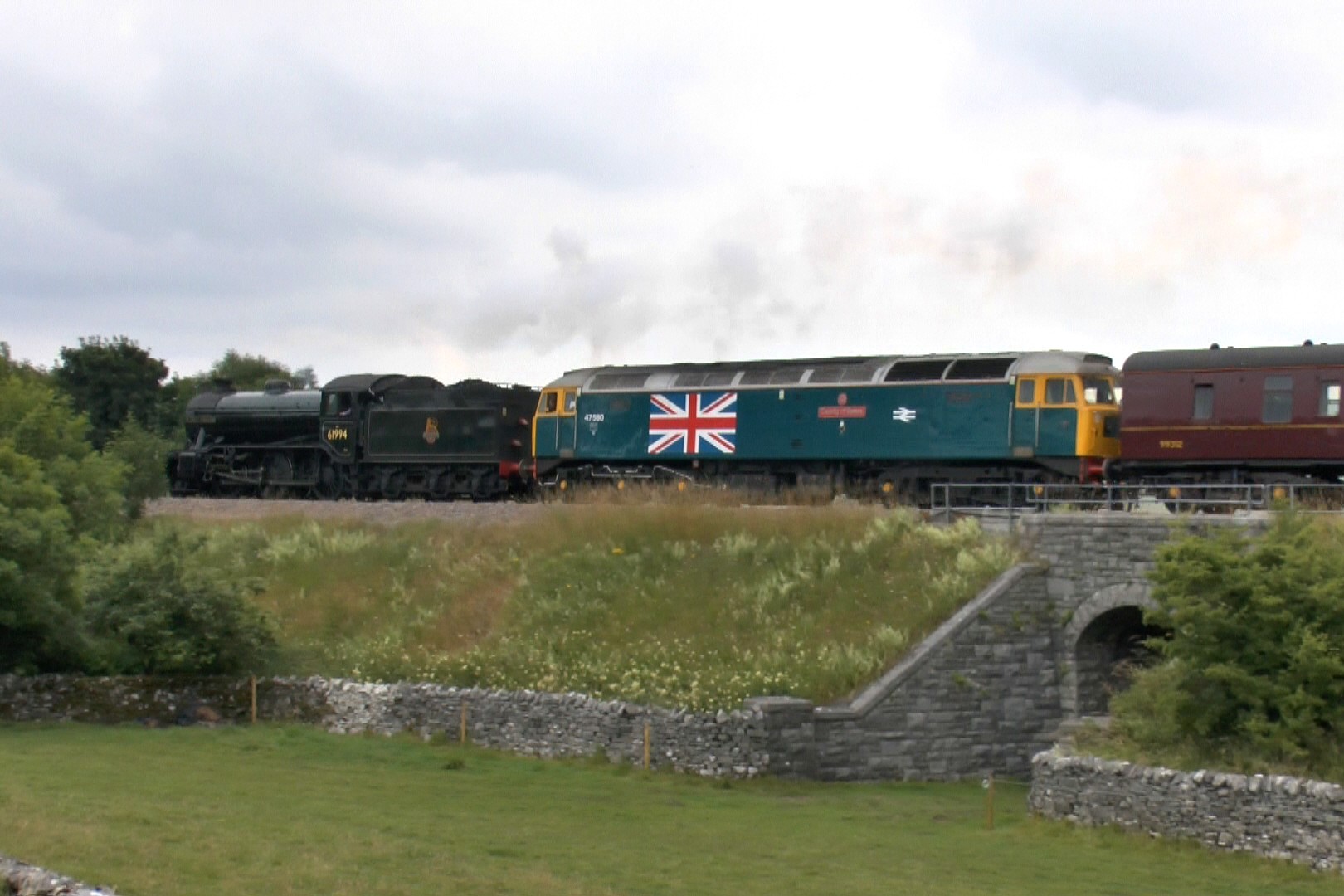 The train is seen at Hoghton, Chatburn and Selside on the outward leg.